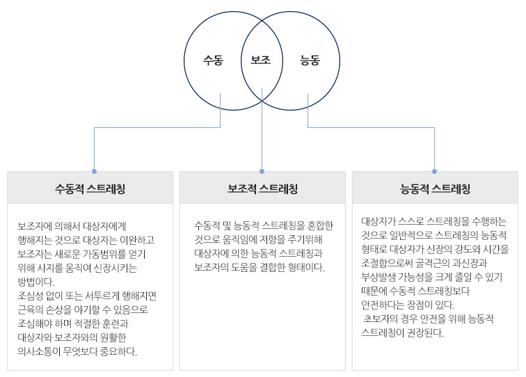 스트레칭 되고 있는 근육에 집중한 주의력과 더불어 편안하고 안전한 스트레칭이다.