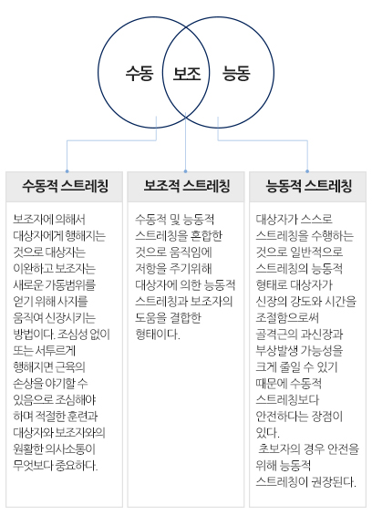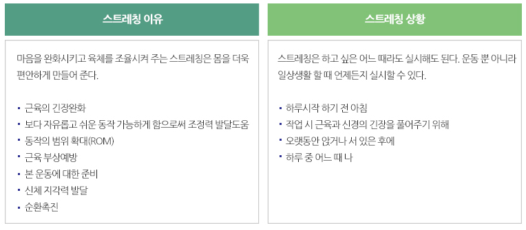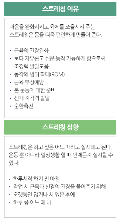 비록 준비운동의 보조로 사용되건, 유연성을 증진시키기 위해 사용되건 스트레칭은 운동의 범위를 넘어 일상생활의 일반적인 유연성과 반복적인 동작들의 유지에도 필수적이다.