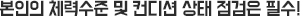 운동 수행 전에 반드시 본인의 체력수준 및 컨디션 상태를 점검해야 한다. 발열, 감기 증상, 설사, 피로, 숙취, 관절 부상 등이 있을 때에는 운동을 삼가는 것이 좋다. 무더운 날씨에 운동할 때에는 운동으로 인한 탈수, 저혈당, 열사병 등의 현상이 초래될 수 있기 때문에 운동 전에 물을 충분히 섭취하고, 열 발산이 잘되는 복장을 입는 것이 좋다.