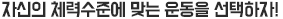 자신의 체력수준에 맞는 운동을 선택하는 것이 중요하며, 운동 시 체력과 컨디션 상태에 따라 운동량과 강도를 조절해야 한다. 평소에 운동을 잘 하지 않던 사람이나 운동 초보자가 욕심을 부려 많은 양의 운동을 수행하는 것을 보게 된다. 이 경우 평소 운동을 하지 않다가 갑자기 운동을 하고 난 다음 느끼는 통증, 일명 운동 후 지연성 근육통(DOMS; Delay of Muscle Syndrome)과 같은 상해가 발생될 수 있다. 이것은 운동을 하지 않은 것만도 못한 결과를 초래한 셈이다. 따라서 효율적인 운동을 위해서 운동량이나 운동 강도를 잘 선택하고 조절해야 한다.