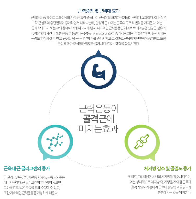 웨이트 트레이닝은 체내의 체지방을 감소시켜주며, 이는 상대적으로 체지방 즉, 지방을 제외한 근육과 골격의 밀도가 높아져 근육이 발달하고 골밀도가 튼튼해지는 것을 의미한다.